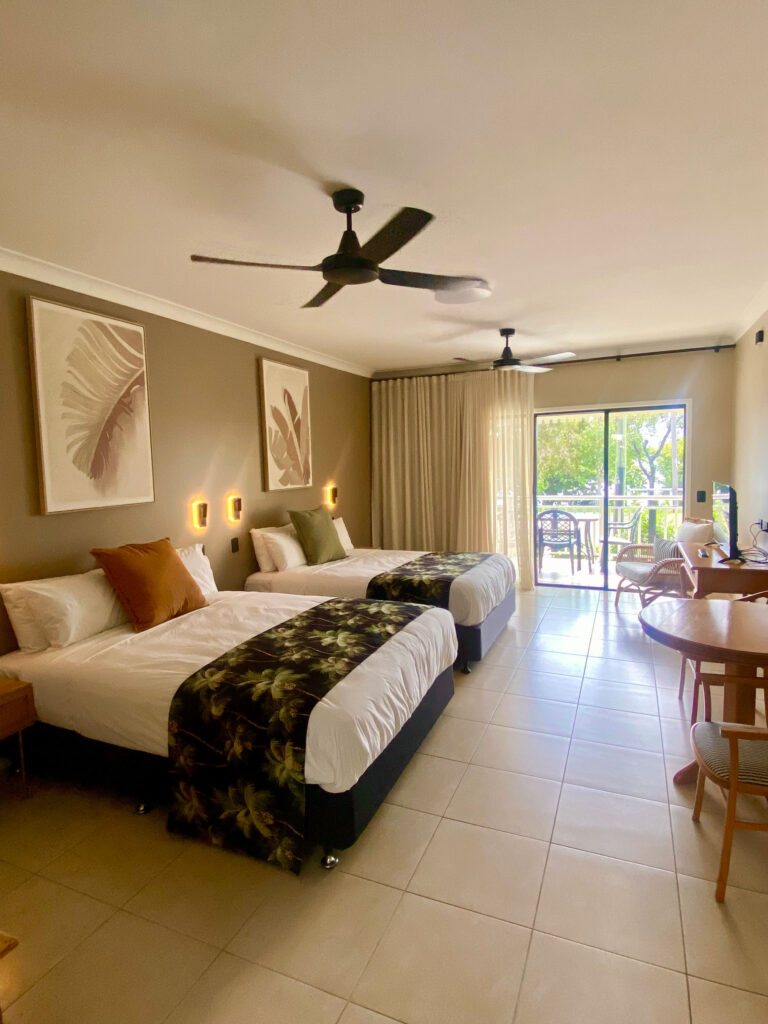 Deluxe Twin room with modified bathroom for ease of access. Like all the Deluxe Twin rooms, the Deluxe Twin – Accessible room is located on the ground floor and is beautifully renovated with two Queen beds and a gorgeous terrazzo tiled shower room. Deluxe Rooms also offer a large private balcony and outdoor setting with front row water views. Maximum occupancy 2 adults and up to 2 children utilising existing bedding.